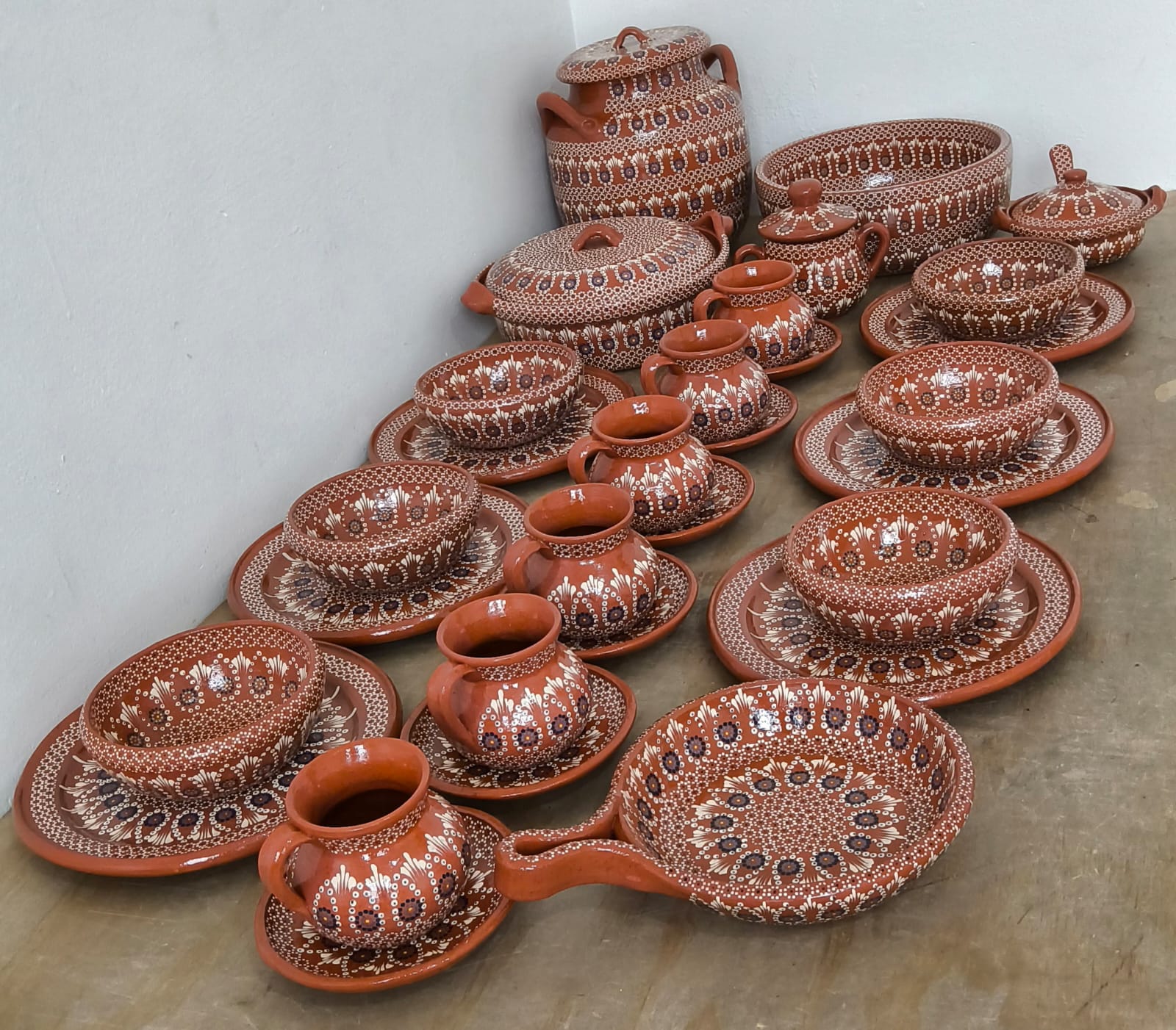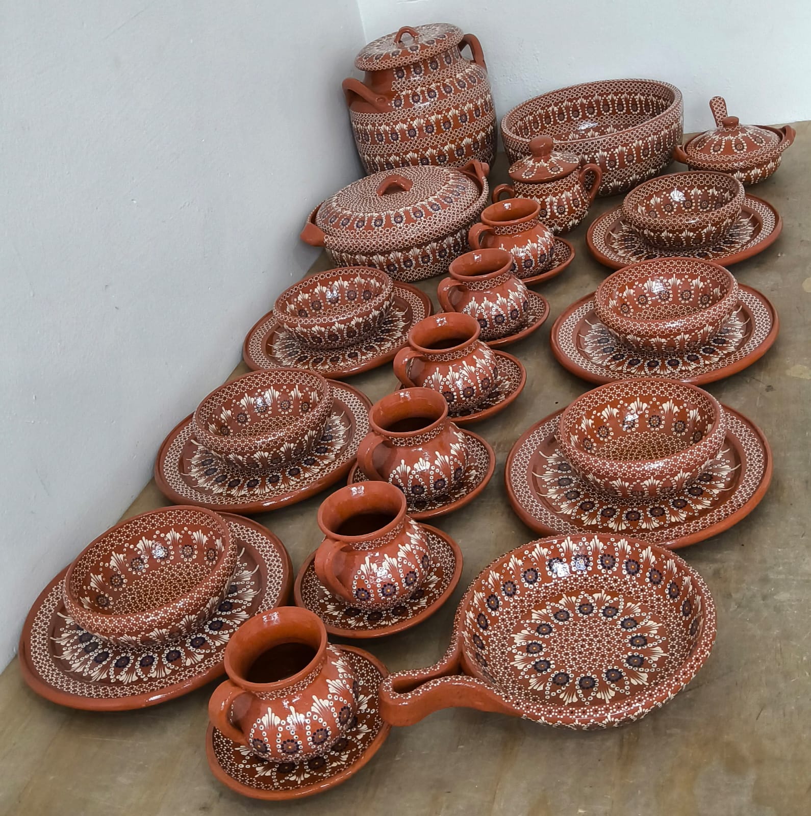 Vajilla completa para 6 personas originaria de Capula, con el tramado característico de la zona. Fondo de color sólido con sellos florales al rededor. Todo esmaltado y elaborado en barro. Incluye 30 piezas: