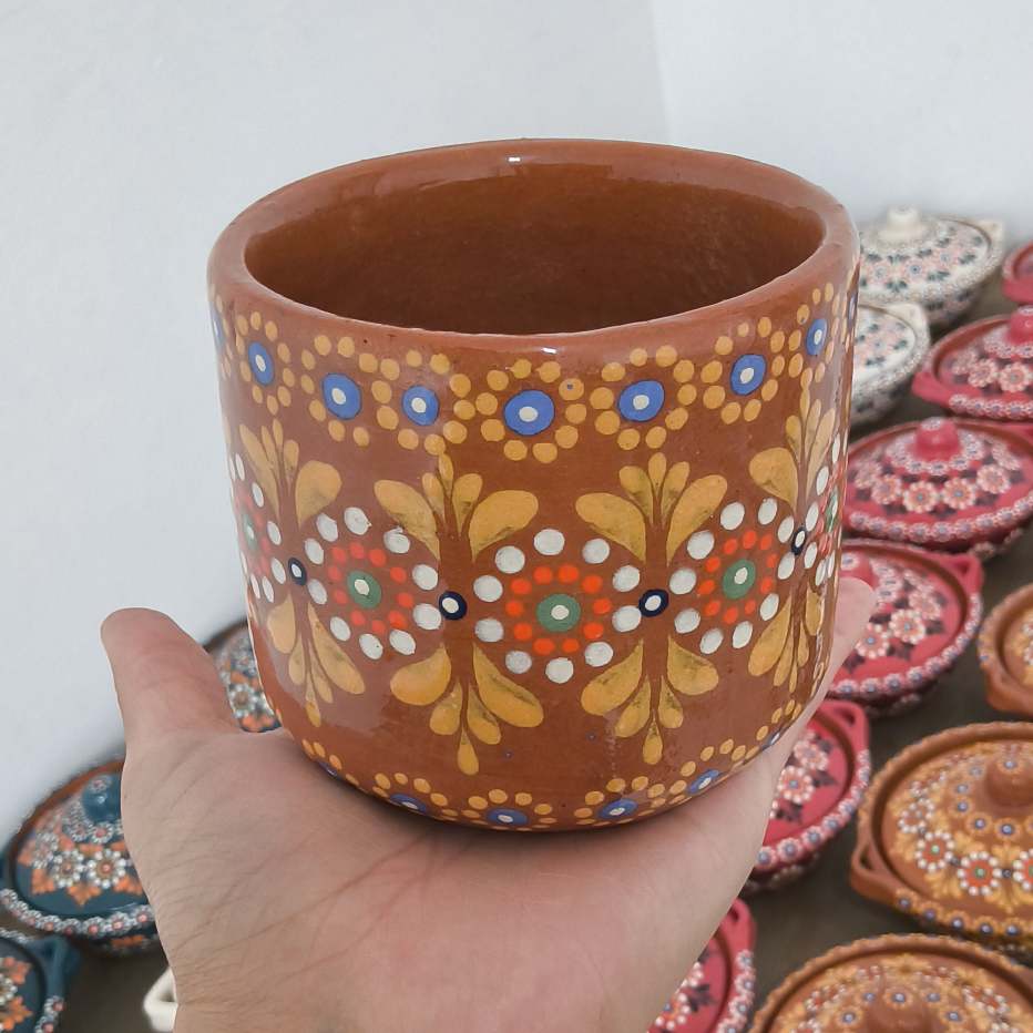 Vaso originario de Capula, con el tramado característico de la zona. Fondo de color sólido con sellos florales al rededor. Todo esmaltado y elaborado en barro. Ideal para agua fresca o cocteles. Medidas: Diámetro: 9.5 cms., Altura: 8 cms. Pieza libre de plomo.