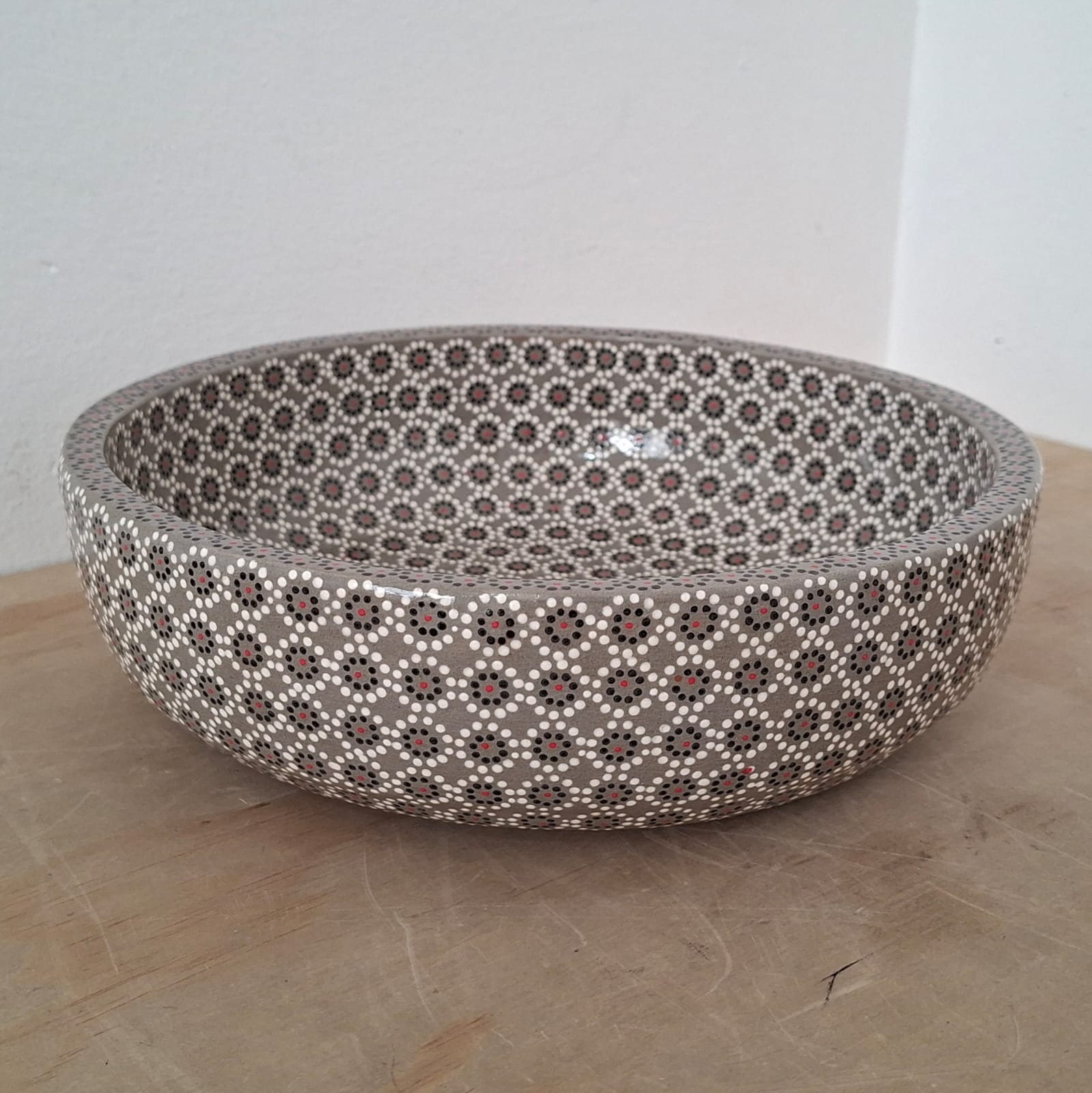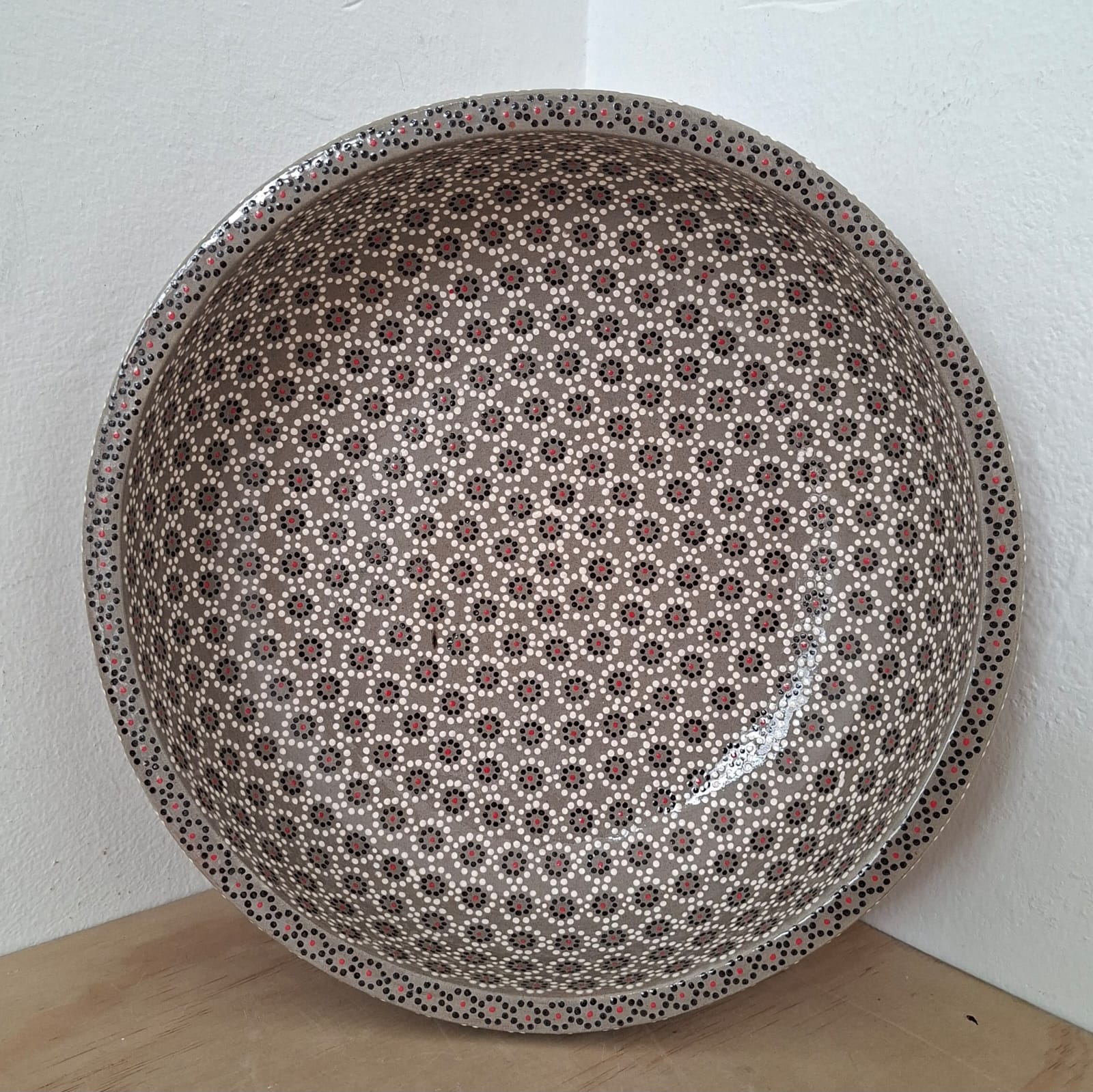 Ensaladera o frutero originaria de Capula, con el tramado característico de la zona. Fondo de color sólido con sellos florales al rededor. Toda esmaltada y elaborada en barro. Ideal para ensaladas o fruta picada. Medidas: Diámetro: 24 cms, Alto 7 cms. Capacidad: 2.4 l. Pieza libre de plomo.