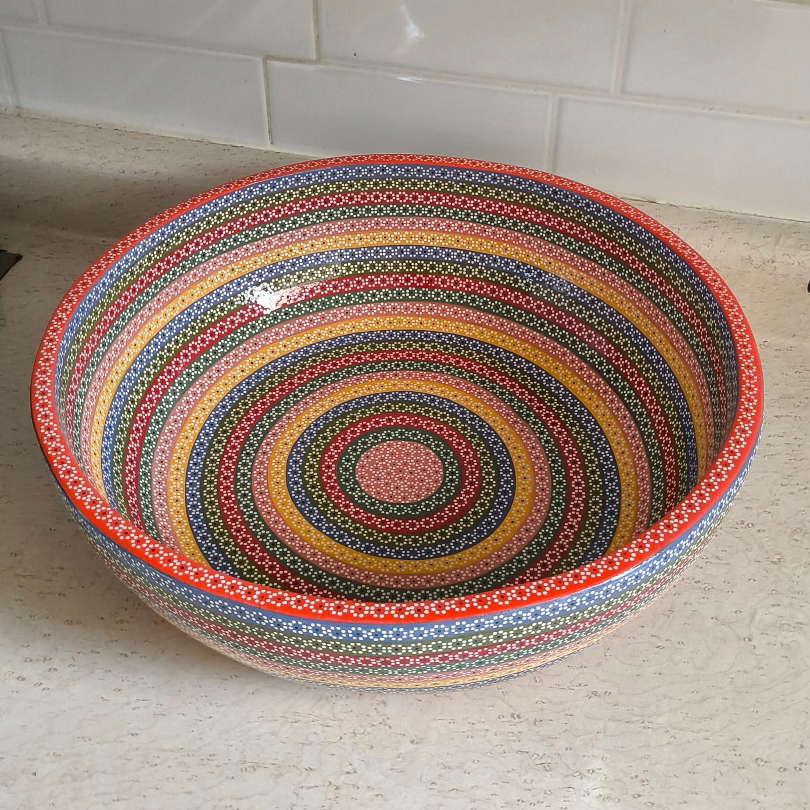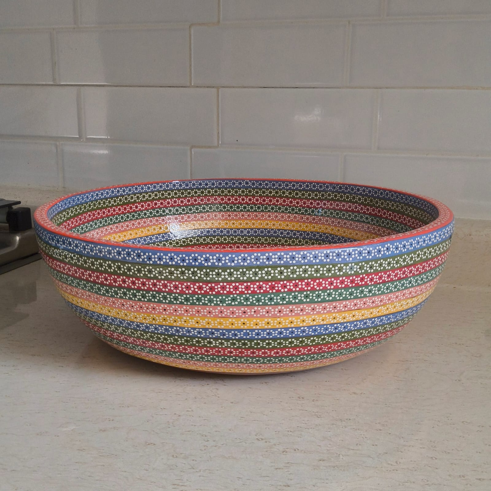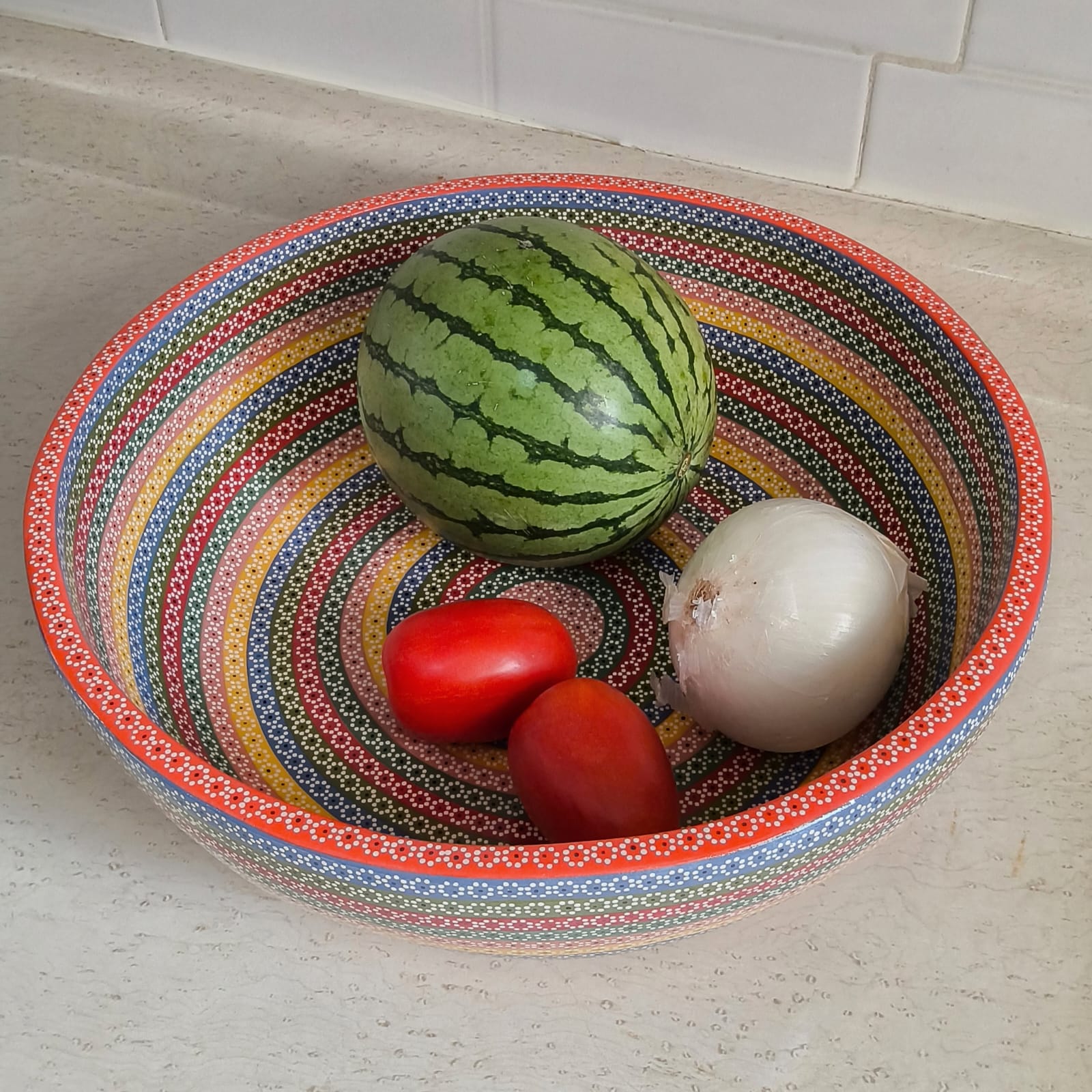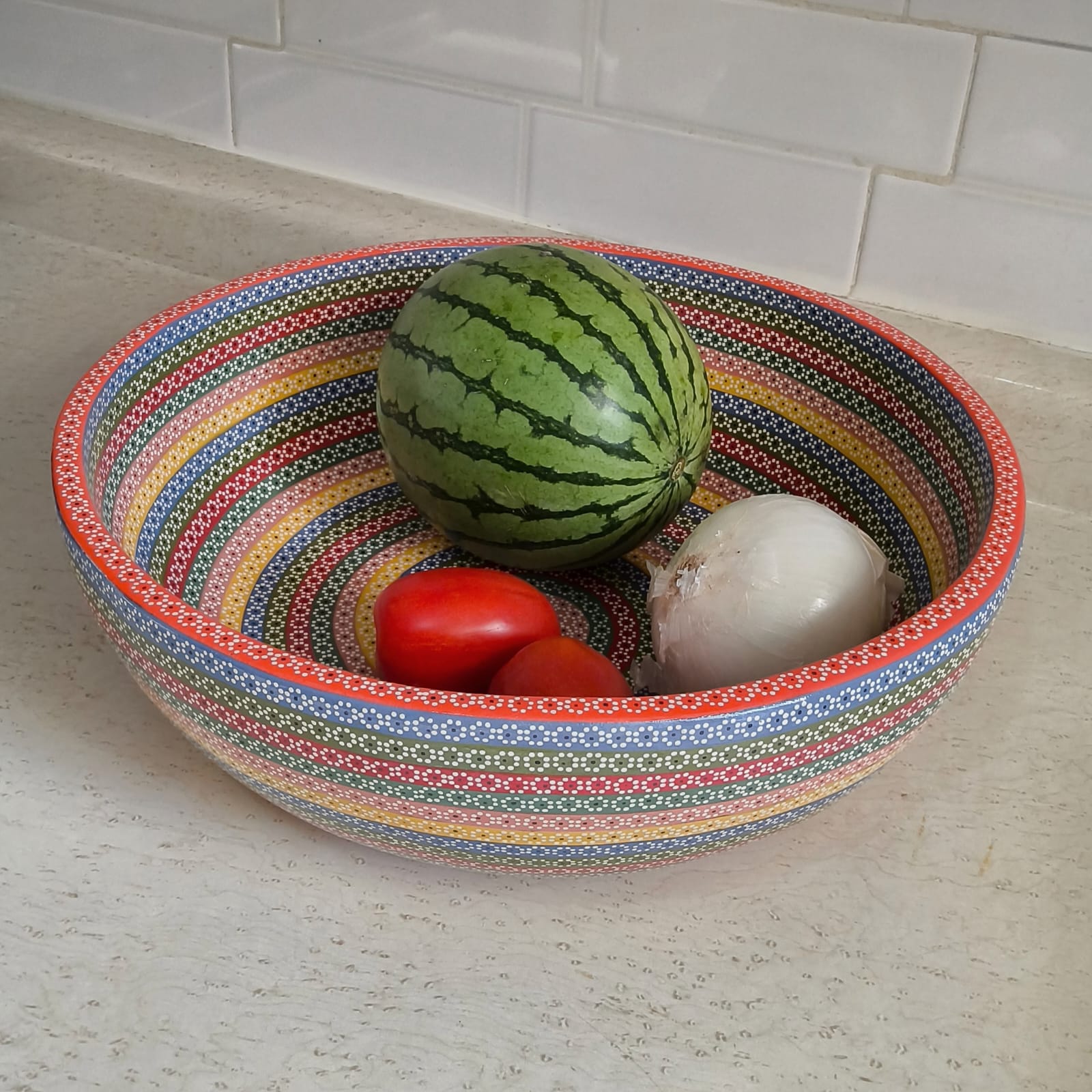 Ensaladera o frutero originaria de Capula, con el tramado característico de la zona. Fondo de color sólido con sellos florales al rededor. Toda esmaltada y elaborada en barro. Ideal para ensaladas o contenedor de fruta. Pieza libre de plomo.